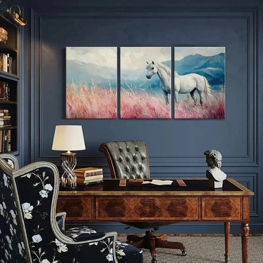 3pcs White Horse In Field Mountain Landscape Metal Print Ready to Hang Art