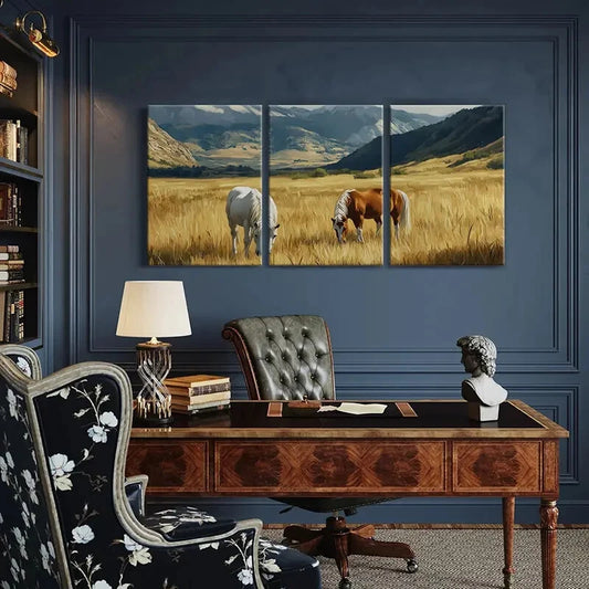 3pcs Artistic Horses Grazing Mountain Landscape Metal Print Ready to Hang Art