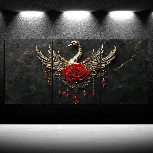 3pcs Red Rose And Golden Swan Bird Themed Metal Print Ready to Hang Art