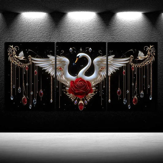 3pcs Red Rose And White Swan Modern Metal Print Ready to Hang Art
