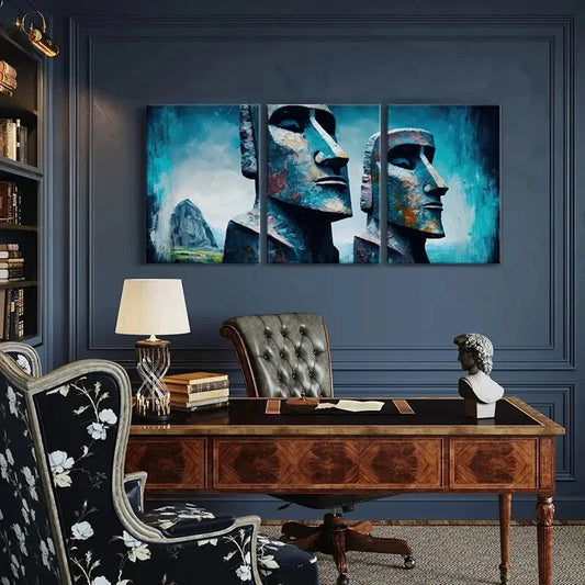 3pcs Abstract Moai Statues Art Blue Tones Textured Metal Print Ready to Hang Art