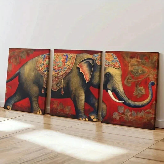 3pcs Elephant Indian Style on Vintage Red Wall Art Set Canvas Framed 40x60cm - High Quality Print 100% Australian Made Wall Canvas Ready to Hang