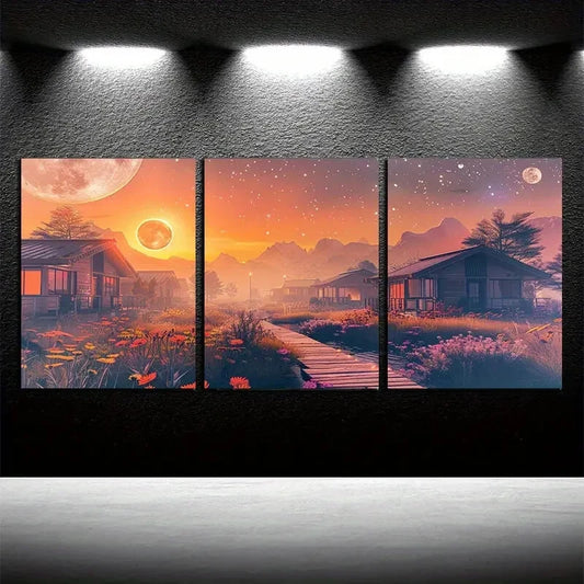 3pcs Vibrant Floral Fields and Moonlit Sky Metal Print Ready to Hang Art