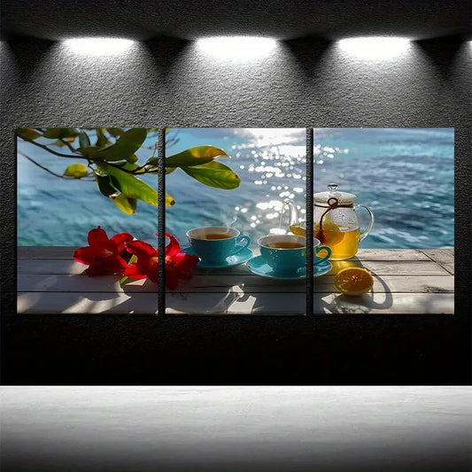 3pcs Tea Leaves and Lemons Standing on a Table Metal Print Ready to Hang Art