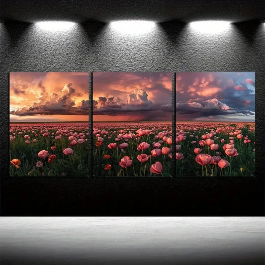 3pcs Cloudy Sky, Flower Fields Illustration Metal Print Ready to Hang Art