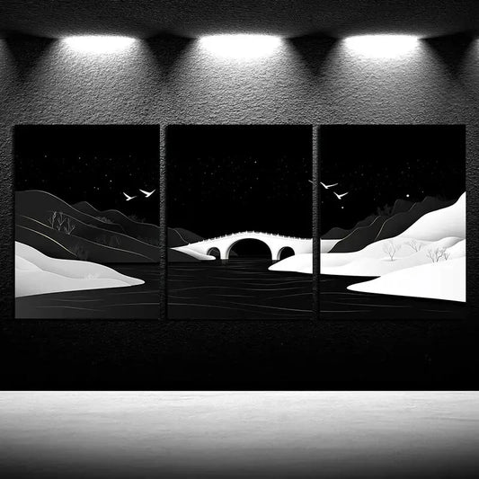 3pcs Black Bridge and Snow-Covered Landscape Metal Print Ready to Hang Art