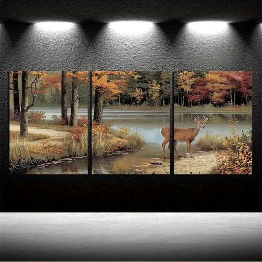 3pcs Autumn Forest Deer with Lake Scene Metal Print Ready to Hang Art