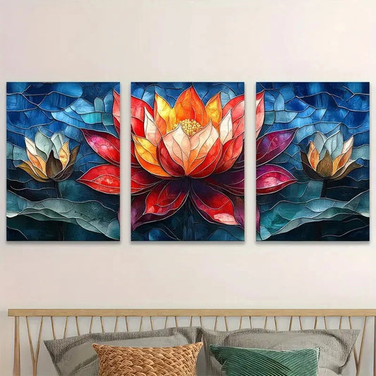 3pcs Lotus Flower Stained Glass Colorful Metal Print Ready to Hang Art