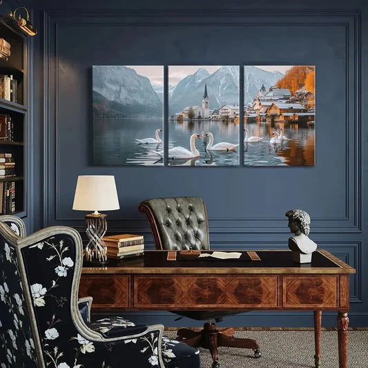 3pcs Swan Alpine Village Snowy Peaks Metal Print Ready to Hang Art