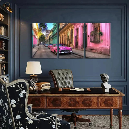 3pcs Vintage Pink Car & Colorful Buildings Metal Print Ready to Hang Art