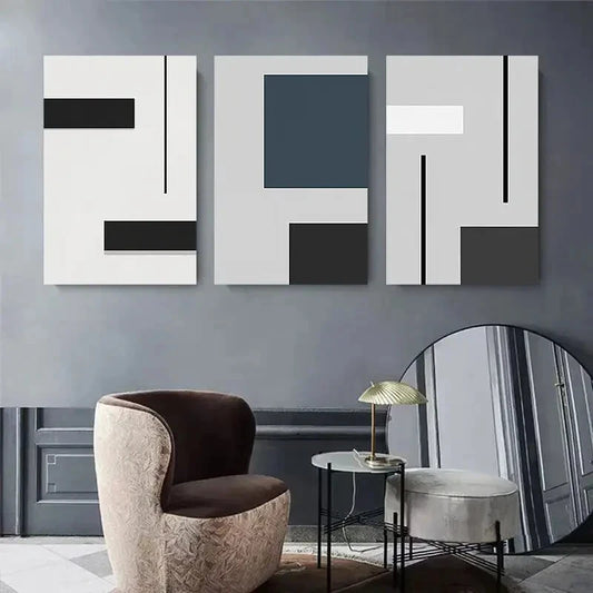 3pcs Abstract Black White & Teal Shapes with Grey Metal Print Ready to Hang Art
