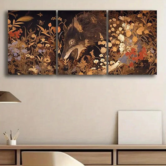3pcs Wolves in Wildflowers & Foliage Metal Print Ready to Hang Art