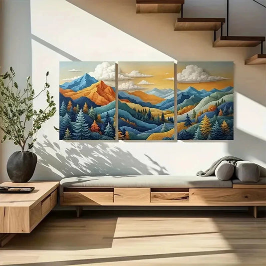 3pcs Golden Blue & Orange Rolling Hills Forests Metal Print Ready to Hang Art