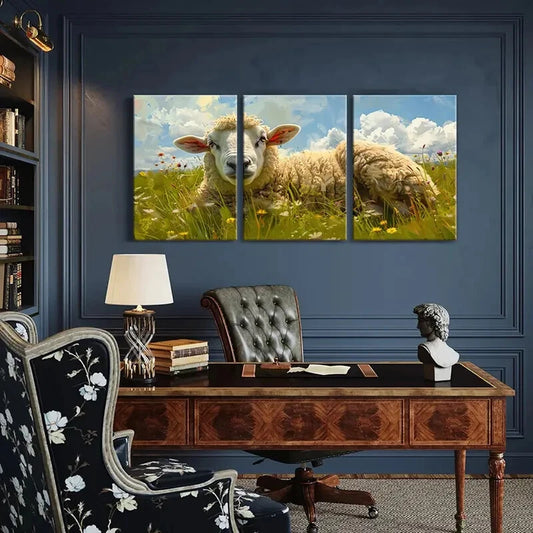 3pcs Pastoral Sheep Vibrant Wildflowers Metal Print Ready to Hang Art