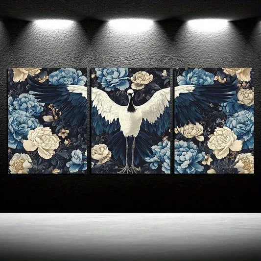 3pcs Serene Blue and White Elegant Crane & Floral Metal Print Ready to Hang Art
