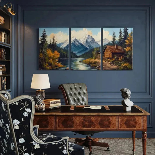 3pcs Mountain Retreat Log Cabin Autumn Colors Metal Print Ready to Hang Art