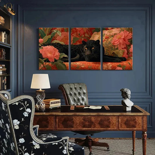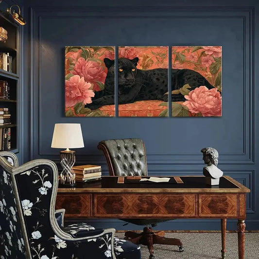 3pcs Black Panther Floral Background Luxurious Metal Print Ready to Hang Art