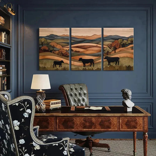 3pcs Woodland Scene Rolling Hills Black Cows Metal Print Ready to Hang Art