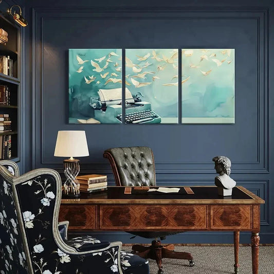 3pcs Flying Birds Typewriter Vintage Art Painting Metal Print Ready to Hang Art
