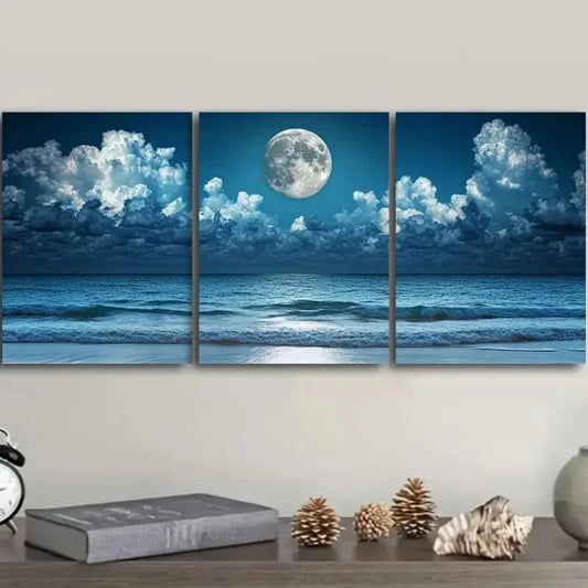 3pcs Beach Waves Themed Full Moon Metal Print Ready to Hang Art
