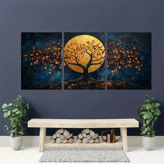 3pcs Abstract Golden Tree with Autumn Leaves Dark Metal Print Ready to Hang Art