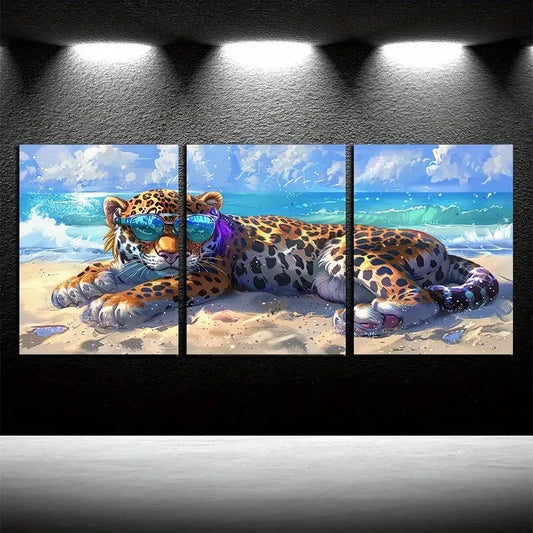 3pcs Cartoonish Leopard in Beach Scene Metal Print Ready to Hang Art