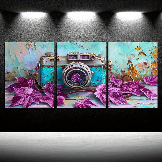 3pcs Vibrant Purple leaves with Old Camera Metal Print Ready to Hang Art