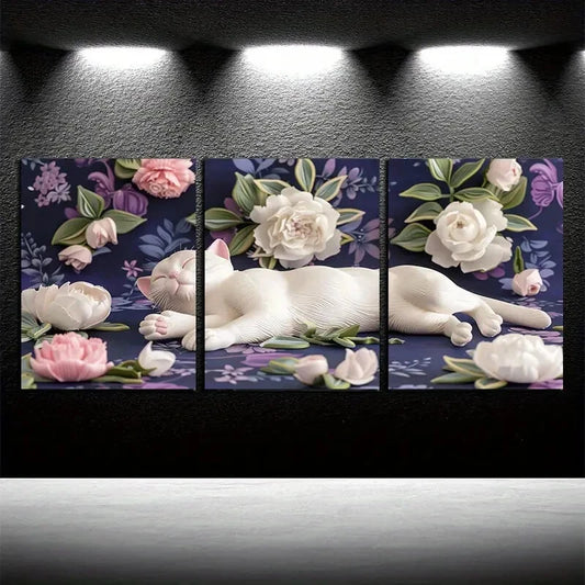 3pcs Vibrant Cat with Florals Design Metal Print Ready to Hang Art