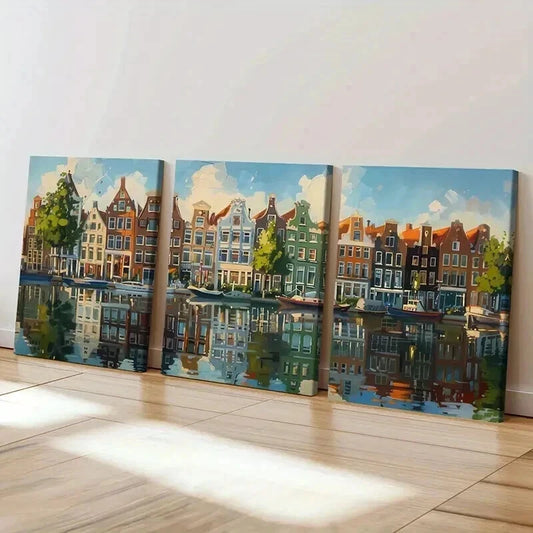 3pcs Amsterdam Canal Scene Reflections Wall Art Set Canvas Framed 40x60cm - High Quality Print 100% Australian Made Wall Canvas Ready to Hang