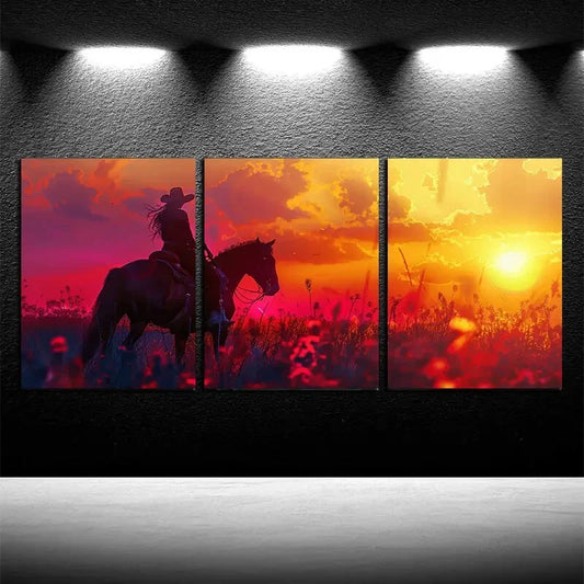 3pcs Vibrant Horseman Sunset Scene Metal Print Ready to Hang Art