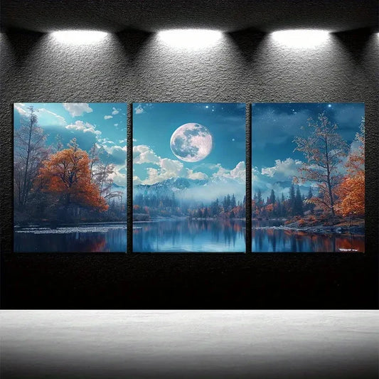 3pcs Autumn Forest & Full Moon Over Lake Scene Metal Print Ready to Hang Art
