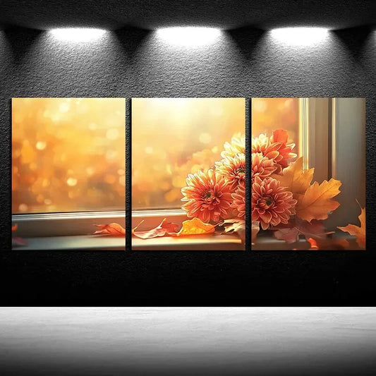 3pcs Vibrant Autumn Floral by Window Design Metal Print Ready to Hang Art