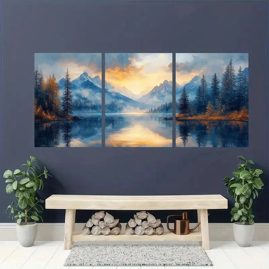 3pcs Serene Alpine Lake Earthy Tones & Sapphire Metal Print Ready to Hang Art