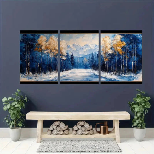 3pcs Handmade Painting Forest Snow Scene Metal Print Ready to Hang Art