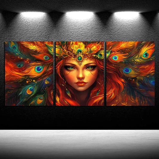 3pcs Vibrant Peacock Feather Girl Illustration Metal Print Ready to Hang Art