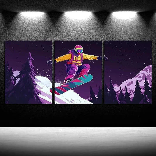 3pcs Snowboarder Skiing in the Snow Illustration Metal Print Ready to Hang Art