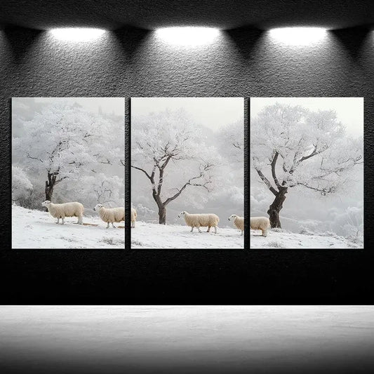 3pcs Flock of Sheep in Snow Metal Print Ready to Hang Art
