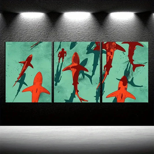 3pcs Modern Sailboat and Shark Ocean Themed Metal Print Ready to Hang Art