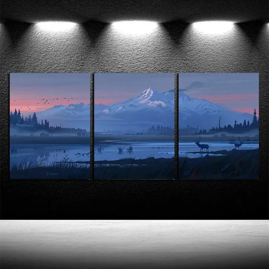 3pcs Majestic Mountain Sunrise & Wildlife Scene Metal Print Ready to Hang Art