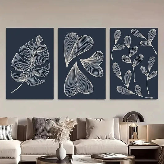 3pcs Dark Blue Minimal Sketch Leaves Metal Print Ready to Hang Art