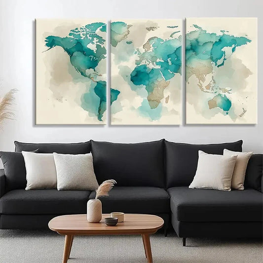 3pcs Abstract Global Map Teal and Beige Tones Metal Print Ready to Hang Art
