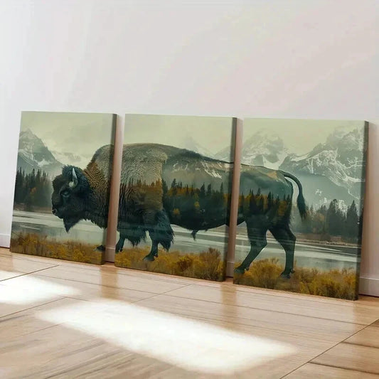 3pcs Buffalo Silhouette with Forest Landscape Wall Art Set Canvas Framed 40x60cm - High Quality Print 100% Australian Made Wall Canvas Ready to Hang