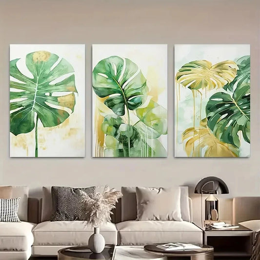 3pcs Monstera Deliciosa Sage Green Golden Boho Metal Print Ready to Hang Art