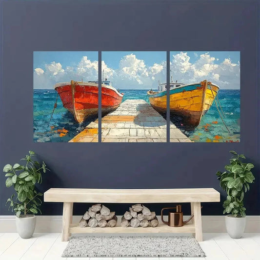 3pcs Coastal Boat Paintings - Oil Impasto Artwork Metal Print Ready to Hang Art