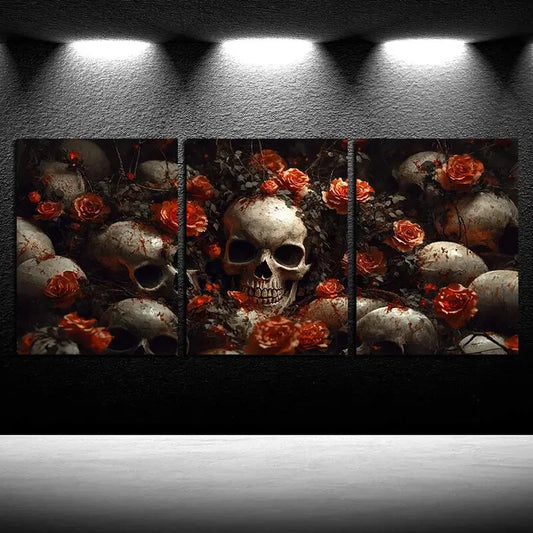 3pcs Skeleton Amidst Blooming Roses, Gothic Floral Metal Print Ready to Hang Art