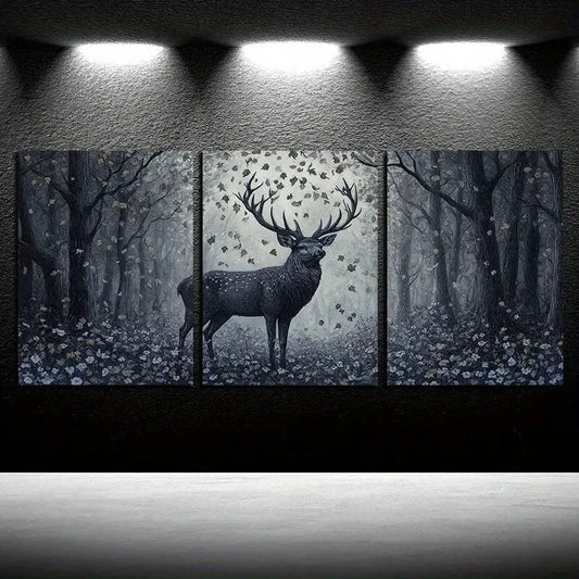 3pcs Leaves Falling on the Forest Deer Dark Theme Metal Print Ready to Hang Art