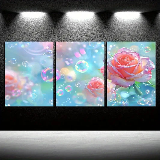3pcs Vibrant Pink Rose with Bubbles Illustration Metal Print Ready to Hang Art