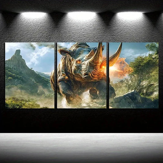 3pcs Savage Rhinoceros Running in the Forest Metal Print Ready to Hang Art