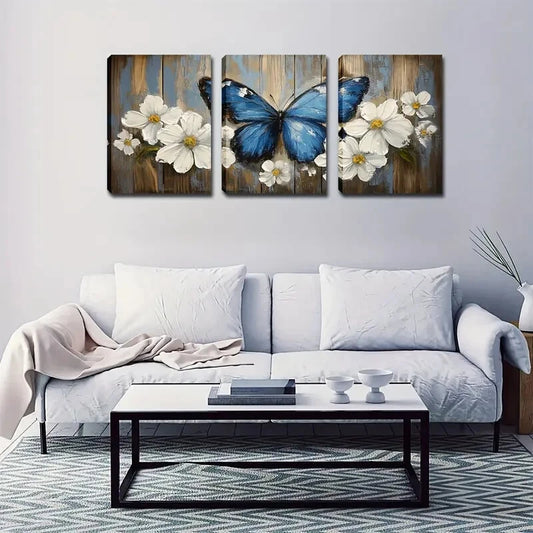 3pcs Blooming Flowers & Blue Butterfly Perfect Wall Art Set Canvas Framed 40x60cm - High Quality Print 100% Australian Made Wall Canvas Ready to Hang