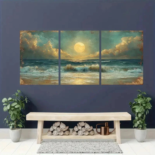 3pcs Moonlit Seaside Vintage Rustic Nature Metal Print Ready to Hang Art